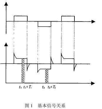 ②正負(fù)勵磁下的同相位采樣。圖1 是對應(yīng)低頻矩形波勵磁形式下的典型電勢信號形式,按上述關(guān)系在一個勵磁周期下 ,若假設(shè) t 1 和 t 2 點(diǎn)為工頻干擾的等效干擾點(diǎn) , 且采樣寬度 T =T 1 =T 2 ,則 e ab 的基本算式為