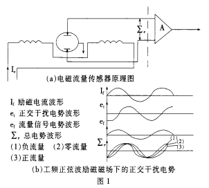 工頻干擾噪聲是由電磁流量傳感器勵磁繞組和流體、電極、放大器輸入回路的電磁耦合,其二是污水流量計工作現(xiàn)場的工頻共模干擾,其三是供電電源引入的工頻串模干擾等,其產(chǎn)生的物理機理均是電磁感應(yīng)原理。*先就電磁流量傳感器勵磁繞組和流體、電極、放大器輸入回路的電磁耦合產(chǎn)生的工頻干擾對污水流量計工作影響*大,而且在不同的勵磁技術(shù)下其表現(xiàn)的形態(tài)、特性不同,因而采取抗干擾措施也不同,電磁流量傳感器原理見圖1(a) 。在工頻正弦波勵磁磁場下,此種電磁耦合工頻干擾噪聲表現(xiàn)形式為正交干擾(見圖1b),又稱為變壓器電勢,其特點是干擾噪聲幅值和工頻正弦波勵磁頻率成正比,相位滯后流量信號電勢90°,且幅值較流量信號電勢大幾個數(shù)量級。