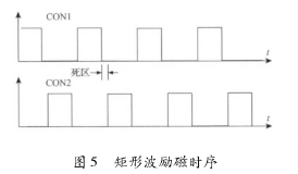 該電路主要由勵磁時序發(fā)生單元、三態(tài)緩沖器及隔離光耦組成。勵磁時序由印染污水流量計系統(tǒng)的控制核心產(chǎn)生。采用DSP的EPWM外設模塊,通過設定其內(nèi)部定時器的工作模式發(fā)出所要求的勵磁頻率的勵磁時序PWM信號CT_1和CT_2。由于勵磁控制系統(tǒng)中的勵磁工作電源的電壓要比DSP的工作電源電壓高得多,為防止勵磁電路故障對系統(tǒng)控制核心產(chǎn)生致命影響,采用光耦將控制部分與勵磁部分進行隔離。另外,由于DSP引腳的驅(qū)動能力有限,所以在DSP與隔離光耦之間加入三態(tài)緩沖器以驅(qū)動隔離光耦的輸入級。并且,DSP能夠通過GPIO口控制三態(tài)緩沖器上的使能引腳來使能和禁止勵磁,以在檢測到電路故障時迅速關斷H橋所有橋臂。該勵磁時序產(chǎn)生電路通過軟件編程可產(chǎn)生如圖5所示的單頻矩形波。在實際應用中,由于組成H橋的達林頓三極管與MOS管導通與關斷的時間不一致,易在勵磁方向切換瞬間,產(chǎn)生上下橋臂同時導通的現(xiàn)象,反映在勵磁電流波形上為一幅值很高的窄脈沖。該脈沖電流不僅容易引起遲滯比較電路的誤輸出,從而導致高低壓切換電路與電流旁路電路的誤動作,而且對恒流控制電路產(chǎn)生沖擊,減小三端穩(wěn)壓芯片的使用壽命,同時還會產(chǎn)生EMC電磁干擾,給測量精度帶來影響。所以實際應用時,如圖5所示對方波勵磁時序添加死區(qū),可以明顯減小上述現(xiàn)象。