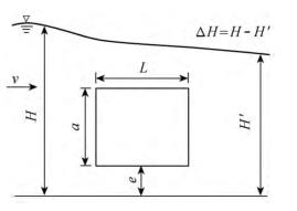 有限水域的浮體結(jié)構(gòu)在不同來流動水中運行時,浮體結(jié)構(gòu)位置的改變會對流場產(chǎn)生影響,從而影響浮體結(jié)構(gòu)的泄流能力以及穩(wěn)定性。試驗過程中固定浮體結(jié)構(gòu)的體型不變(長L=0.20m,寬B=0.30m,高a=0.10m),分別選取4種不同來流流量Q及浮體結(jié)構(gòu)位置e,控制浮體結(jié)構(gòu)在上、下游水位不變的條件下進行試驗,具體試驗參數(shù)設計及說明見表1以及圖2。