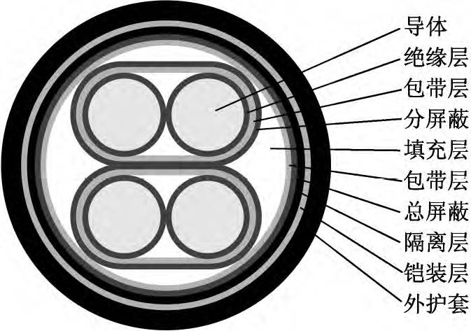 該新型電纜的結(jié)構(gòu)如圖1所示。導(dǎo)體為單股退火鍍錫軟銅線,以提高導(dǎo)體的導(dǎo)電性和防腐蝕性。在導(dǎo)體外繞包一層?。疲矗ň鬯姆蚁┌雽?dǎo)電帶,有利于降低導(dǎo)體和絕緣之間的摩擦起電噪音。絕緣采用材料較為純凈、介電常數(shù)較小、具有一定彈性的聚丙烯絕緣級材料,并采用擠壓式擠出,減小絕緣層與導(dǎo)體的間隙。采用對絞組作為信號傳輸線,由于在兩根傳輸線上感應(yīng)的電壓接近相等,減小了電壓差值,提高了信號傳輸穩(wěn)定性;對絞組由兩種不同顏色絕緣線芯組成,相鄰線對對絞節(jié)距應(yīng)不大于100mm。對絞分屏蔽組(即對對絞組進(jìn)行分屏蔽,每對對絞組外繞包兩層聚酯帶和一層厚0.04mm鋁塑復(fù)合帶繞包,內(nèi)置一根7×0.26mm鍍錫銅絞線作引流線)有利于對不同對絞組之間信號串音的抑制和隔離。對絞分屏蔽組同心式絞合成纜,在對絞分屏蔽組間填充非吸濕性材料,以保證纜芯圓整。在成纜纜芯外繞包兩層聚酯帶,再采用鋁塑復(fù)合帶繞包,內(nèi)置鍍錫銅線作引流線,以提高電纜電磁屏蔽能力??偲帘螌油鈹D包隔離層(隔離護(hù)套),隔離層采用絕緣級低密度聚乙烯材料。隔離層外采用鎧裝層,鎧裝材料為高導(dǎo)磁合金鋼帶,其為強(qiáng)磁材料,可將外來的磁通大部分限制在鎧裝層的外表面上(僅有少部分能進(jìn)入被屏蔽的空間);鎧裝時對高導(dǎo)磁合金鋼帶采用縱包焊接,確保其形成一連續(xù)圓柱管;鎧裝層可提高電纜抗電磁干擾水平以及對電纜進(jìn)行加強(qiáng),減少電纜振動引起的電動勢。外護(hù)套采用藍(lán)色軟PVC(聚氯乙烯)護(hù)層級電纜材料擠包,實(shí)現(xiàn)電纜防護(hù)。