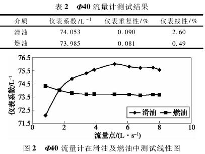 依據(jù)表1測試數(shù)據(jù),經(jīng)計(jì)算可得,Φ40流量計(jì)在滑油及燃油中測試結(jié)果如表2所示,測試線形圖如圖2所示。