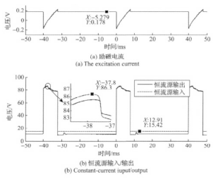 由圖7曲線結(jié)合圖2可知,在勵磁方向切換后,檢流電路檢測到的圖7(a)中的勵磁電流瞬間為負,此時勵磁線圈處于電能泄放狀態(tài)并向能量反饋電路中的儲能電容充電。由于儲能電容充電,高、低壓切換電路的輸出電壓從80V逐漸升高;待勵磁線圈能量泄放完即勵磁電流為零時,儲能電容兩端電壓達到*高86V并開始放電,勵磁電流開始上升;儲能電容電壓降低至80V時,高低壓切換電路趨于80V的穩(wěn)定輸出狀態(tài),此時勵磁電流繼續(xù)上升;待勵磁電流上升至設(shè)定的超調(diào)量205 mA后,遲滯比較電路控制高低壓切換電路切換至17V低壓源作為勵磁工作電源,恒流電路在17V低壓源輸入下進行恒流控制輸出。