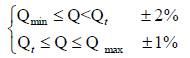 由圖2 可見,儀表系數(shù)可分為二段,即線性段和非線性段。在非線性段, 實(shí)際特性受軸承摩擦力、流體粘性阻力影響較大。當(dāng)流量低于Qmin 時(shí),儀表系數(shù)隨著流量迅速變化。壓力損失與流量的平方成正比關(guān)系。通常線性段約為工作段的2/3,其特性與渦輪結(jié)構(gòu)參數(shù)及流體粘性有關(guān)。隨流量的變化其儀表系數(shù)K 也會(huì)有一定的變化,但變化不大,通常將其變化幅度稱為流量計(jì)的計(jì)量準(zhǔn)確度。對于產(chǎn)品設(shè)計(jì)而言,期望能將線性段的流量范圍拓展,一臺(tái)流量計(jì)能覆蓋同口徑的不同流量范圍,使得產(chǎn)品量程比變寬從而降低生產(chǎn)管理與生產(chǎn)批量加工成本。對于1.0 級的高壓機(jī)油流量計(jì),以Qt(0.2Qmax)為分界流量點(diǎn),將計(jì)量線性分為兩段,其中一段的*大允許誤差為±2%,而另一段的*大允許誤差為±1% 。按圖2 所示,通常每臺(tái)渦輪流量計(jì)均有較為相似特性曲線,若將可測量流量范圍做寬,就能在同口徑不同流量范圍進(jìn)行分段截取,以實(shí)現(xiàn)一臺(tái)流量計(jì)能覆蓋同口徑的不同流量范圍。