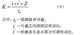 根據(jù)實(shí)際流量計(jì)的所測得儀表系數(shù)K 更換對應(yīng)齒輪傳動(dòng)比,使機(jī)械表頭顯示部分和齒輪轉(zhuǎn)動(dòng)發(fā)出低頻脈沖輸出均與高頻脈沖輸出匹配,實(shí)際三者關(guān)系如下: