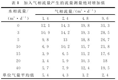 利用清水中渦輪的刻度方程計(jì)算加入不同氣體流量后渦輪響應(yīng)頻率所對(duì)應(yīng)的流量,即為加入氣體后的測(cè)量流量,再用所得測(cè)量流量減去配比的標(biāo)準(zhǔn)水流量,得到氣相加入后測(cè)量的絕對(duì)增加值,即加入氣相流量產(chǎn)生的測(cè)量誤差(見(jiàn)表1)。計(jì)算結(jié)果表明,加入氣體流量后,渦輪的測(cè)量流量明顯增加,尤其是液相流量較低時(shí),增加的測(cè)量流量更高,氣體對(duì)流量測(cè)量產(chǎn)生了較大的測(cè)量誤差。低氣量下,平均1m3/d的氣量產(chǎn)生的測(cè)量誤差大約相當(dāng)于5m3/d(絕對(duì)增加值)。