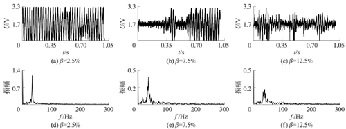 試驗發(fā)現(xiàn),氣相的加入對過熱蒸汽流量計測量的影響顯著,譜分析和脈沖計數(shù)兩種方法隨著氣相注入的增加其表現(xiàn)也不同。圖4反映了水流量12m3/h時,注入不同氣含率β時A點的模擬信號,如圖4(a~c)所示;經(jīng)譜分析后得到的頻率值,如圖4(d~f)所示;用脈沖計數(shù)方法得到的脈沖信號,如圖4(g~i)所示。圖4顯示,當注入氣量不大時,對過熱蒸汽流量計的影響不大,無論是譜分析結果還是脈沖計數(shù)得到的結果都比較好。當注入的氣量進一步增加時,渦街原始信號強度和穩(wěn)定性逐漸變差,渦街頻率信號會被干擾信號所淹沒,反映到譜分析圖是,渦街頻率的譜能量減小,干擾信號的譜能量加強;對于脈沖信號,會因為一些旋渦信號減弱,形成脈沖缺失現(xiàn)象,而不能真實地反映渦街產(chǎn)生的頻率。