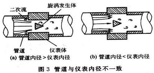 而丙烷流量計(jì)與安裝管道內(nèi)徑也會(huì)存在誤差,或大或小,如圖3所示,當(dāng)被測(cè)介質(zhì)經(jīng)過時(shí),也會(huì)發(fā)生二次流動(dòng),對(duì)測(cè)量結(jié)果產(chǎn)生波動(dòng)影響。