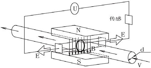 液體管道流量計主要由信號轉換器與傳感器構成,其原理是基于法拉利電磁感應定律,在其傳感器中與被測管軸線垂直方向安裝一對檢測電極,當其接入液態(tài)介質管道,導電液態(tài)物質沿管軸側運動時,導電液體作切割磁力線運動而產生感應電動勢,此感應電動勢由其兩個電極測出,其理論數(shù)值為: