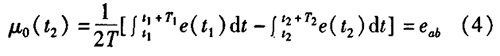 污水廠進(jìn)水管道流量計一般都采用工頻交流電源供電,其電源電壓的幅值和頻率的變化都會給污水廠進(jìn)水管道流量計帶來電源性干擾噪聲。對電源電壓的幅值變化,因采用多級集成穩(wěn)壓,一般而言電源電壓的幅值變化對電磁流量的測量精度影響不大。當(dāng)電源電壓的頻率波動時,雖然其波動范圍有限,但對污水廠進(jìn)水管道流量計測量精度影響較大。為了解決工頻干擾問題,實現(xiàn)對流體流速感應(yīng)電勢e柚信號的準(zhǔn)確測量,需利用以下基本關(guān)系:①勵磁周期為工頻周期的整數(shù)倍,即勵磁頻率為50/nHz(n為偶數(shù));②正負(fù)勵磁下的同相位采樣。圖2是對應(yīng)低頻矩形波勵磁形式下的典型電勢信號形式,按上述關(guān)系在一個勵磁周期下,若假設(shè)t。和t:點為工頻干擾的等效干擾點,且采樣寬度T=T1=T2,則e –ab的基本算式為:,