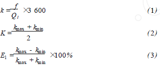 將乙烯流量計在標(biāo)準水裝置上,分別用頻譜分析和脈沖計數(shù)的方法進行標(biāo)定,流體介質(zhì)為水未加氣體,采用的標(biāo)準傳感器為精度等級為0.2級的電磁流量計。在每個流量測量點上的儀表系數(shù)用公式(1)計算,然后用式(2)計算得到*終儀表系數(shù)K。Ql為被測水的流量值,f為每一個流量點得到的頻率,k為每個測量點得到的儀表系數(shù)。kmax、kmin分別為試驗流量范圍內(nèi)得到的*大與*小的儀表系數(shù)。儀表系數(shù)的線性度E1用式(3)來計算。