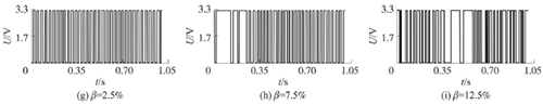 試驗發(fā)現(xiàn),氣相的加入對乙烯流量計測量的影響顯著,譜分析和脈沖計數(shù)兩種方法隨著氣相注入的增加其表現(xiàn)也不同。圖4反映了水流量12m3/h時,注入不同氣含率β時A點的模擬信號,如圖4(a~c)所示;經(jīng)譜分析后得到的頻率值,如圖4(d~f)所示;用脈沖計數(shù)方法得到的脈沖信號,如圖4(g~i)所示。圖4顯示,當(dāng)注入氣量不大時,對乙烯流量計的影響不大,無論是譜分析結(jié)果還是脈沖計數(shù)得到的結(jié)果都比較好。當(dāng)注入的氣量進一步增加時,渦街原始信號強度和穩(wěn)定性逐漸變差,渦街頻率信號會被干擾信號所淹沒,反映到譜分析圖是,渦街頻率的譜能量減小,干擾信號的譜能量加強;對于脈沖信號,會因為一些旋渦信號減弱,形成脈沖缺失現(xiàn)象,而不能真實地反映渦街產(chǎn)生的頻率。