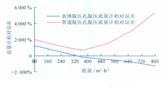 從以上數(shù)據(jù)表和曲線圖中可以看出:天燃?xì)饬髁坑?/strong>型號一定的情況下,用表體取壓孔取壓方式檢定流量計時流量計的線性度較好,用管道取壓孔取壓方式檢定流量計時流量計的線性度較差;流量測點相同的情況下,表體取壓孔取壓檢定方式的流量計誤差較小,管道取壓孔取壓檢定方式的流量計誤差較大;兩種取壓方式引起的誤差隨著流量的增大而逐漸增大,在流量為2?。梗埃埃恚常钑r兩者相差近6.2%,遠(yuǎn)遠(yuǎn)超出了流量計的準(zhǔn)確度等級。所以,在天燃?xì)饬髁坑?/strong>的檢定過程中,應(yīng)避免在流量計表體取壓孔以外的地方取壓進行檢定。