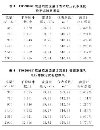 以使用廣泛的DN100B天燃?xì)饬髁坑?/strong>為例,系統(tǒng)運行時間為60s,標(biāo)準(zhǔn)裝置的滯止平均溫度為28.9℃,空間平均濕度為30%,流量計的平均溫度為28.3℃,在表體取壓孔取壓和管道取壓孔取壓的流量計檢定試驗數(shù)據(jù)分別如表1、2所示。