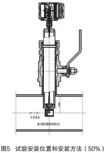 對插入式煙氣流量計和插入式電磁流量計的結(jié)構(gòu)原理進(jìn)行分析,插入式電磁流量計的信號采集點在標(biāo)校管道內(nèi)12.5% 為宜,因它屬電磁類流量計,而煙氣流量計是根據(jù)“卡門渦街”原理進(jìn)行測量管道內(nèi)流量,根據(jù)標(biāo)校管道內(nèi)層流和湍流的分析,以及插入式煙氣流量計獨特的探頭結(jié)構(gòu)形式,確定插入式煙氣流量計的插入深度為標(biāo)校管道內(nèi) 50%,試驗安裝位置和安裝方法如圖 5 所示。
