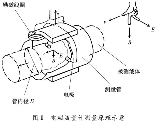 智能型防腐電磁流量計的測量原理如圖 1 所示。根據(jù)法拉*電磁感應(yīng)定律,導(dǎo)電液體在磁場中流動會產(chǎn)生電動勢 E,它與磁感應(yīng)強(qiáng)度 B、導(dǎo)電液體平均流速 v 成一定比例關(guān)系: