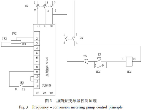 STD - Ⅲ型浮選工藝參數(shù)自動(dòng)測(cè)控系統(tǒng)通過(guò)雙膜盒差壓計(jì)測(cè)量原礦漿濃度; 采用插入式電磁流量計(jì)測(cè)量原礦漿流量,由 PLC 計(jì)算出入浮干煤泥量和藥劑的瞬時(shí)添加量,用變頻式計(jì)量泵完成浮選藥劑的添加。通過(guò)上位機(jī)還可以打印小時(shí)、班、天及月的運(yùn)行數(shù)據(jù),更加有利于生產(chǎn)管理及技術(shù)分析,藥劑自動(dòng)原理如圖 2 所示,k1、k2、k3 是計(jì)算修正參數(shù)。以 PID 算法為核心,通過(guò)優(yōu)化控制程序計(jì)算出藥劑給定量,在捕收劑和起泡劑管道上分別安裝藥劑測(cè)量裝置,用于檢測(cè)藥劑的添加量。當(dāng)藥劑測(cè)量值小于藥劑給定量時(shí),PID 輸出增大,反之則減小。加藥泵變頻器控制原理如圖 3 所示。