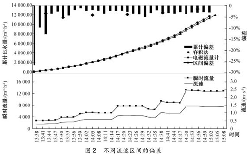 圖 2 的結(jié)果顯示,容積法校驗電磁流量計累計偏差開始階段不穩(wěn)定,后期趨于穩(wěn)定,在 -3. 0%附近。這是測量中不可避免存在某幾個時刻(特別出廠水流量改變時)某些測量點液位波動較大,導(dǎo)致記錄數(shù)值與真實情況存有較大差異,一開始累計出水總量較少,偏差會相對放大,在后期累計水量大,這一原因?qū)е碌钠顪p少,偏差值也趨于穩(wěn)定。