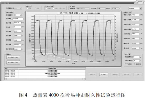 本文研究的 4000 次冷熱沖擊試驗(yàn)的實(shí)現(xiàn)具有以下特點(diǎn): (1)基于“工控機(jī) +水泵 + 煤油流量計(jì)”的閉環(huán)控制系統(tǒng),實(shí)現(xiàn)了流量自動(dòng)反饋調(diào)節(jié),滿足試驗(yàn)要求; (2)通過(guò)四個(gè)開(kāi)關(guān)閥的時(shí)序切換,自動(dòng)控制試驗(yàn)溫度,很好的完成了 4000 次溫度沖擊試驗(yàn); (3)通過(guò)“工控機(jī) + 數(shù)據(jù)數(shù)據(jù)采集卡”的數(shù)據(jù)采集系統(tǒng),實(shí)時(shí)監(jiān)控試驗(yàn)過(guò)程中的流量、溫度、壓力等相關(guān)參數(shù),實(shí)現(xiàn)試驗(yàn)方式的自動(dòng)控制,并能對(duì)試驗(yàn)數(shù)據(jù)進(jìn)行分析與評(píng)定。 (4)試驗(yàn)的全過(guò)程為智能自動(dòng)化,可無(wú)人員留守看護(hù)。試驗(yàn)結(jié)果可直接反映出熱量表在長(zhǎng)時(shí)間運(yùn)行后的可靠性。為我國(guó)熱量表耐久性試驗(yàn)研究提供檢測(cè)手段,為促進(jìn)產(chǎn)品質(zhì)量提升做好技術(shù)保障。
