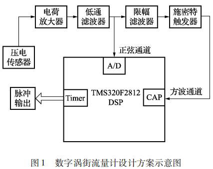 本文設(shè)計的基于 TMS320F2812 DSP 的數(shù)字煙氣流量計的信號處理系統(tǒng)由前置放大電路和數(shù)字信號處理電路兩部分組成。本文選用的前置放大電路即為目前被廣泛應(yīng)用的普通煙氣流量計的前置放大電路,主要由電荷放大電路、低通濾波電路、限幅濾波電路和施密特觸發(fā)電路組成; 對于經(jīng)壓電傳感器測得的渦街信號采用了頻域分析和時域分析相結(jié)合的方式,即由前置放大電路和數(shù)字信號處理電路相配合。時域分析通道利用 DSP 事件管理器的捕獲模塊,對前置放大電路輸出的方波進行頻率計算,然后再由 DSP 事件管理器通用定時器的比較輸出模塊進行脈沖輸出。頻域分析通道即 DSP對低通濾波電路輸出的疊加了許多噪聲的正弦信號進行 A/D 采樣,再利用 DSP 對 A/D 采樣的結(jié)果進行頻譜分析,從而得出此時渦街信號的頻率,*后由 DSP 通用定時器的比較輸出模塊進行脈沖輸出。系統(tǒng)設(shè)計方案示意圖如圖 1 所示。