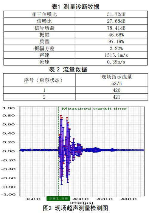 在高負荷段采用泵送補給水狀態(tài):測試時間 2018年10月11日,采用德國FLUEX高精度外夾式超 聲波流量計作為標準流量計,測量基礎數(shù)據(jù):管道 外徑276.93mm,管壁厚度12.40mm,采用兩聲程169mm傳感器安裝距離,通過對超聲波流量計信號 分析與診斷(數(shù)據(jù)見表1、表2和圖2),診斷數(shù)據(jù) 提示標準超聲波流量計測量狀況佳,檢測開始,啟 動補給水泵,運行一段時間流量穩(wěn)定后,測量結果 如下: