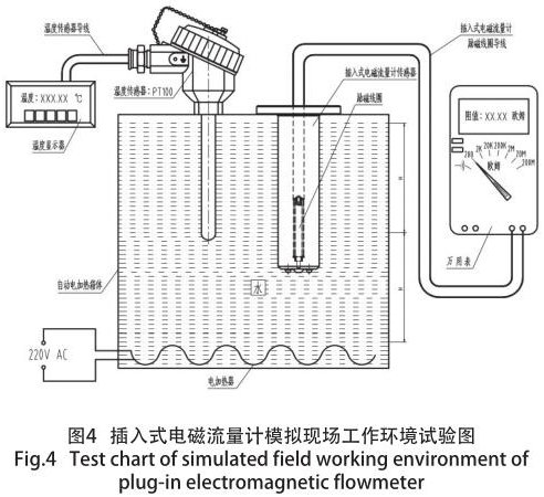 其原因是:勵磁線圈的阻值及匝數(shù)是按照常溫狀態(tài)下進行設(shè)計的,而含有勵磁線圈的煤層注水流量計經(jīng)常是高于常溫狀態(tài)下進行安裝、使用(如:高爐回水、供熱管道等),勵磁線圈的阻值隨使用環(huán)境溫度的變化而變化,致使煤層注水流量計測量時的準(zhǔn)確度大為降低,性能的不確定性大為增加,為了保證儀表的高準(zhǔn)確度和穩(wěn)定性,在不同的季節(jié)(主要是環(huán)境溫度和介質(zhì)溫度),經(jīng)過大量模擬現(xiàn)場實際情況的試驗,并結(jié)合轉(zhuǎn)換器的技術(shù)參數(shù)要求,得出一個完善的勵磁線圈各種技術(shù)參數(shù)。模擬現(xiàn)場試驗裝置如圖 4 所示。