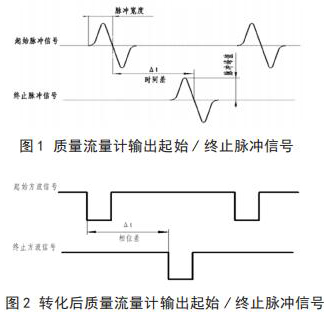 高壓電磁流量計流量與相關(guān)測試設(shè)備連接起來,就可以進行高壓電磁流量計的校準(zhǔn),時間差△ t 由專用試驗測試設(shè)備可以測出。起始脈沖信號和終止脈沖信號如圖 1 所示。經(jīng)過專用試驗測試設(shè)備信號轉(zhuǎn)化后的信號方波如圖 2 所示。