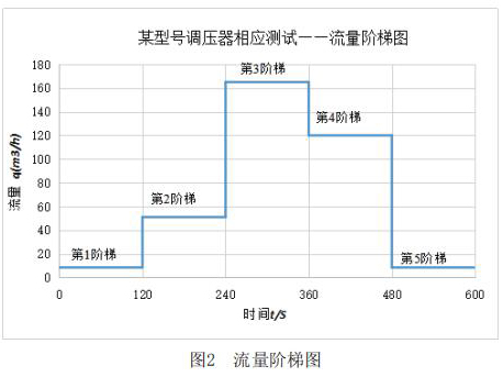 該測(cè)試主要利用實(shí)驗(yàn)室測(cè)試條件,模擬客戶現(xiàn)場(chǎng)使用情況。其主要測(cè)試內(nèi)容包括:測(cè)試分體式電磁流量計(jì)在+23℃,-30℃和-40℃三種溫度下,分體式電磁流量計(jì)出口壓力分別在2.1kPa和30kPa時(shí),流量分別從*1階梯到*5階梯時(shí)的響應(yīng)速度,客戶所提供的流量階梯如圖2所示。橫軸表示下游球閥開啟動(dòng)作時(shí)間,縱軸表示分體式電磁流量計(jì)下游需要的流量q。