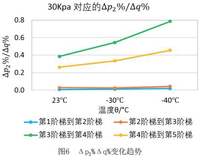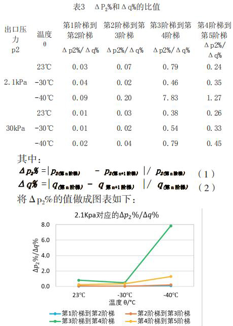 為了更直觀嚴(yán)謹(jǐn)?shù)膶?duì)比每個(gè)階段響應(yīng)速度的不同,對(duì)原始數(shù)據(jù)進(jìn)行處理,得到如下表格2和表格3。將△p2%/△q%作為響應(yīng)速度的直觀量化表達(dá),若△p2%/△q%的值大,說明單位流量變化照成的出口壓力變化大,即說明分體式電磁流量計(jì)響應(yīng)相對(duì)較慢,反之亦然。