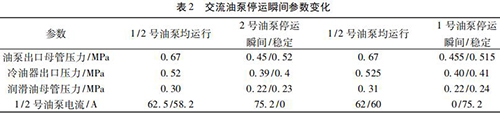 通過(guò)內(nèi)部旁通將冷油與熱油混合,經(jīng)過(guò)銅粉- 煤油 - 蠟感溫元件控制冷熱油混合比例,將油溫調(diào)節(jié)到 49 ℃。一臺(tái)智能電磁流量計(jì)穩(wěn)定運(yùn)行,油泵出口母管壓力 0. 5 MPa,潤(rùn)滑油母管壓力 0. 24 MPa,均屬于正常情況,而兩臺(tái)交流油泵并列運(yùn)行時(shí),停運(yùn)其中一臺(tái)交流油泵瞬間會(huì)觸發(fā)智能電磁流量計(jì)出口母管壓力開(kāi)關(guān)動(dòng)作,說(shuō)明停運(yùn)瞬間油壓發(fā)生波動(dòng),且油泵出口母管油壓波動(dòng)至小于 0. 45 MPa。正常運(yùn)行時(shí)智能電磁流量計(jì)出口油溫 71.5 ℃,冷油器出口溫度45 ℃,混合后潤(rùn)滑油母管溫度52.5 ℃,由能量守恒定律可知,經(jīng)過(guò)冷油器的油量/不經(jīng)冷油器的油量= ( 71.5-52.5) ÷ ( 52.5- 45) = 2. 53,說(shuō)明有 70% 左右的油量經(jīng)過(guò)冷油器。當(dāng) 2 臺(tái)智能電磁流量計(jì)運(yùn)行時(shí)油量大于單泵運(yùn)行,其中一臺(tái)智能電磁流量計(jì)瞬間停運(yùn)時(shí)油量減少,尤其是經(jīng)過(guò)冷油器的油量大量減少,油量在溫控閥二次分配過(guò)程中出現(xiàn)調(diào)節(jié)異常,導(dǎo)致油壓過(guò)大波動(dòng)。為檢驗(yàn)溫控閥工作情況,保持 1 號(hào)、2 號(hào)交流油泵運(yùn)行,選取機(jī)組正常帶負(fù)荷運(yùn)行時(shí)油溫 52 ℃,分別停運(yùn) 1、2 號(hào)交流油泵,觀察 1、2 號(hào)交流油泵停運(yùn)瞬間油泵出口母管壓力波動(dòng)情況,試驗(yàn)各參數(shù)變化見(jiàn)表 2。