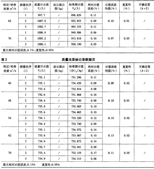 表1是用容積法現(xiàn)場(chǎng)檢測(cè)流量計(jì)后,電腦自動(dòng)生成的原始記錄數(shù)據(jù)頁部分,表2是用質(zhì)量法現(xiàn)場(chǎng)檢測(cè)流量計(jì)后,電腦自動(dòng)生成的原始記錄數(shù)據(jù)頁部分。