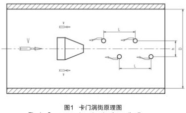 煙氣流量計(jì)實(shí)現(xiàn)流量測量的理論基礎(chǔ)是流體力學(xué)中**的“卡門渦街”原理,在流動(dòng)的流體中裝置一個(gè)非線性三角柱形體,即渦旋發(fā)生體,如圖 1 所示。當(dāng)流體沿渦旋發(fā)生體繞流時(shí),會(huì)在渦旋發(fā)生體下游產(chǎn)生兩列不對稱,但有規(guī)律交替地分離釋放出一系列漩渦束,只有當(dāng)兩渦漩列之間的距離 h 和同列的兩渦漩之間的距離 L 之比滿足 h/L=0.281 時(shí),所產(chǎn)生的渦街才是穩(wěn)定的。