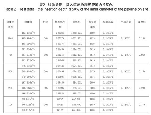 煙氣流量計(jì)插入深度為現(xiàn)場管道內(nèi)徑的50%時(shí),試驗(yàn)數(shù)據(jù)如下(以 DN200 為例):