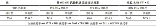 隨著火電機組利用小時數(shù)降低,發(fā)電企業(yè)一般都會根據(jù)不同負(fù)荷工況下的實際運行小時數(shù),確定機組熱耗率考核權(quán)重,形成*終的加權(quán)熱耗率考核值。考核加權(quán)熱耗率對設(shè)備廠家末級葉片選型、高壓調(diào)門與高壓缸匹配性提出了更高的要求,在當(dāng)前負(fù)荷率偏低的情況下增強了發(fā)電企業(yè)的競爭力。然而,僅僅對加權(quán)熱耗率進(jìn)行考核是不夠的,設(shè)備廠家為了增強自身的競爭力,往往會把全部重點放在如何降低占比大的低負(fù)荷熱耗率上而犧牲高負(fù)荷的熱耗率,這無疑削弱了發(fā)電企業(yè)的適應(yīng)性。某廠一臺 600MW 汽輪機通流改造時僅對加權(quán)熱耗率進(jìn)行考核,THA 熱耗率要高出設(shè)計值43. 7 kJ/( kW·h) ,詳見表 1。通流改造時既要對加權(quán)熱耗率進(jìn)行考核,也要對 THA工況時熱耗率進(jìn)行考核。