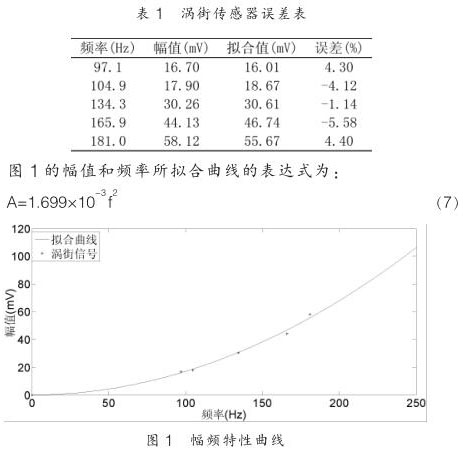 其中 K 1 為儀表系數(shù), D 為管道直徑。在管道口徑 D 不變,流體密度不變的情況下,渦街傳感器的輸出幅值與 f 2 成正比,具體表達(dá)形式可以根據(jù)實驗測出。本文以 50mm 口徑氣體實驗為例,數(shù)據(jù)如表 1 所示: