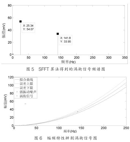 從圖 5 可以看出 SFT 算法能夠很好恢復(fù),對渦街信號的頻率恢復(fù)沒有誤差,而幅值的誤差不超過 1% ,這對含有強(qiáng)振動噪聲的渦街信號精確測量至關(guān)重要;圖 6 是經(jīng) SFT 頻譜分析所得到的數(shù)據(jù)通過幅頻特性曲線來辨別是噪聲信號還是渦街信號。通過幅頻關(guān)系的信號處理方法可以從含有振動的混合信號中識別渦街信號,從而達(dá)到提高液化氣流量計抗振動性能的目的。
