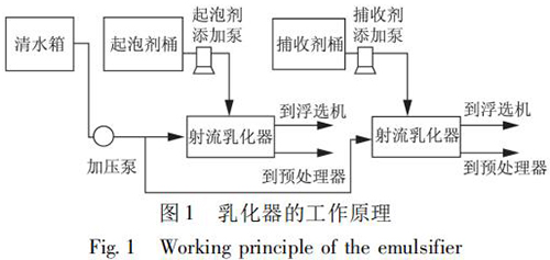 選煤廠浮選藥劑乳化裝置是將藥劑和水制成乳化液,實(shí)現(xiàn)藥劑的合理使用,將對(duì)浮選效果和節(jié)約藥劑起到一定的作用。在使用中可根據(jù)藥劑和水的配制比例觀察藥劑的乳化效果,通過乳化器操作箱內(nèi)的的電位器調(diào)整水泵轉(zhuǎn)速,即調(diào)整乳化壓力。自動(dòng)加藥控制是根據(jù)入浮流量與入浮濃度的檢測結(jié)果,控制起泡劑與捕收劑的加入。乳化器的工作原理如圖 1 所示。