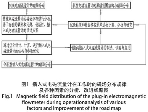 測水流量計因其特殊的結(jié)構(gòu)形式,致使其抗干擾能力較弱、準(zhǔn)確度偏低以及瞬時流量波動過大等不良現(xiàn)象,但便于安裝、造價低廉、普遍應(yīng)用于大管道等特點而存在。為了發(fā)揮其優(yōu)勢,消除其不利因素,對其內(nèi)部結(jié)構(gòu)及其相關(guān)技術(shù)參數(shù)進行優(yōu)化設(shè)計,從而使其準(zhǔn)確度能夠達到 ±1% FS,使抗干擾能力得到極大地增強。本文主要通過優(yōu)化設(shè)計、選擇材料和試驗,使測水流量計的穩(wěn)定性和準(zhǔn)確度大幅度提高,并提出解決措施,對實際應(yīng)用具有參考價值。分析與研究程序圖如圖 1 所示。