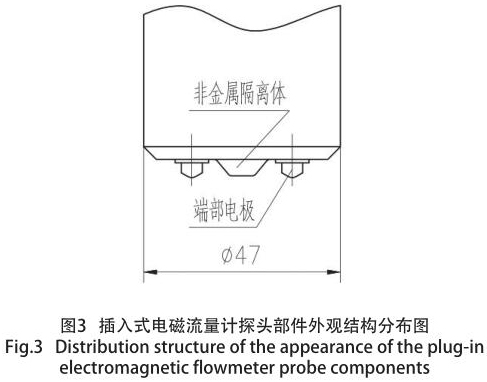 通過大量的試驗,對探頭端部外型結(jié)構(gòu)亦采用特殊設(shè)計,從而消除兩個電極之間的擾流現(xiàn)象,同時亦消除因通電產(chǎn)生磁場,導(dǎo)致兩個電極吸附介質(zhì)中的鐵屑而影響測量精度和死區(qū)效應(yīng),增強了輸出信號的穩(wěn)定性,從而提高傳感器準(zhǔn)確度和抗干擾性。通過結(jié)構(gòu)的優(yōu)化設(shè)計,使用壽命更長,測水流量計探頭局部,如圖 3 所示。