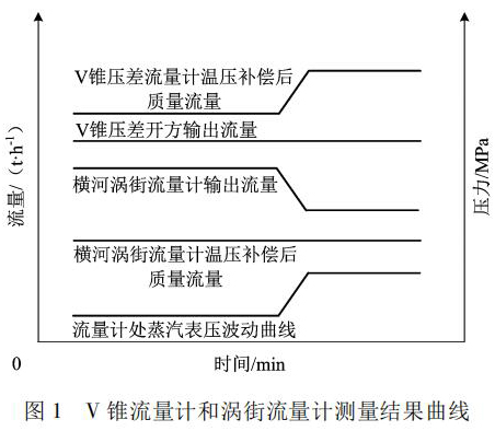根據(jù)物料平衡反復(fù)研究,渦街流量計(jì)測(cè)量的質(zhì)量流量動(dòng)態(tài)曲線比較客觀反映了蒸汽流量的變化; 而 V 錐流量計(jì)測(cè)量的質(zhì)量流量偏大 5%。說(shuō)明該差壓流量計(jì)元件沒(méi)能產(chǎn)生和實(shí)際流量變化對(duì)應(yīng)的差壓。