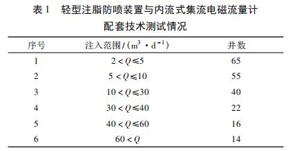 在實(shí)際應(yīng)用中,使用輕型注脂防噴裝置與內(nèi)流式集流智能型渦輪流量計(jì)配套技術(shù)對(duì)喇叭口在射孔層上注聚井進(jìn)行測(cè)試。輕型注脂防噴裝置與內(nèi)流式集流智能型渦輪流量計(jì)配套技術(shù)施工工藝參見文獻(xiàn),測(cè)試情況見表 1 所示,低注入量井( ≤10 m3 /d) 占到 56. 60% 。