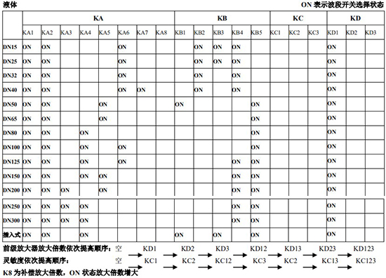 RG=1-F 調(diào)放大器增益,由 1 至 F 依次增大(常用 4-8);RS=1-F 調(diào)觸發(fā)靈敏度,由 1 至 F 依次提高(常用 4-8)不同口徑和介質(zhì)開關(guān)選擇參見附表。并根據(jù)實(shí)際信號先調(diào)整 K2 和 K3 擴(kuò)展頻帶,必要時(shí)調(diào)整 K1 電荷放大器增益