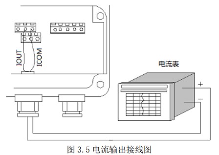 使用電流輸出線(4-20mA)時,應(yīng)注意到導(dǎo)線的電阻與負載電阻之和不得大于 750Ω 。電流輸出接線見圖 3.5。