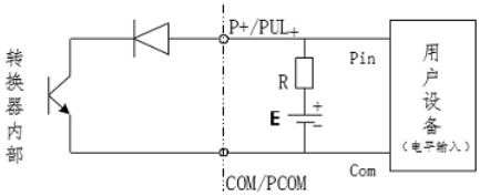 PUL+/ P+、ALM+(AH)、ALM-(AL)和 PDIR(FDIR)均為集電極開路(OC 門)輸出(參閱圖 3.6b、3.6d,用戶接線時必須參照如下電路外接電源和負載: