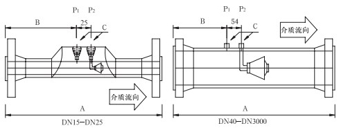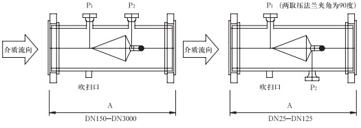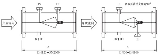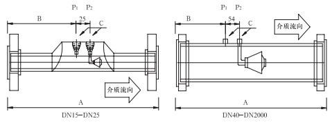 取壓口法蘭公稱直徑(標準設計)為DN40,也可以依據(jù)用戶要求選取法蘭直徑。