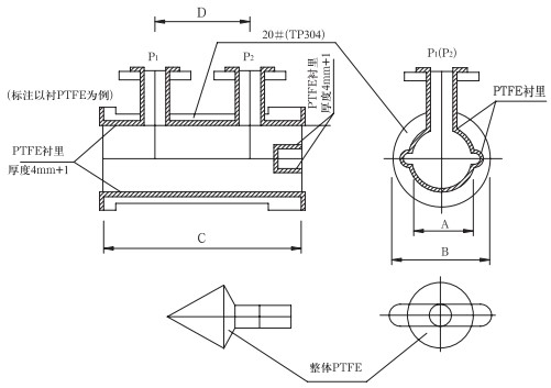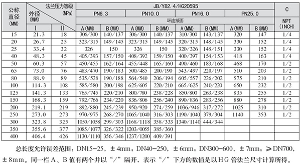 2.尺寸表中同一欄值有兩個并以/隔開,表示/下方的數(shù)值是以HG管法蘭尺寸計算所得。