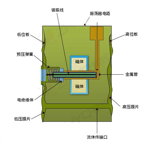 由磁場驅(qū)動的振蕩器電路會導致導線以其共振頻率振蕩。導線的一側(cè)牢固地固定到靜態(tài)部件,而另一側(cè)則連接到膜片。彈簧使電線預緊。由于過程壓力對隔膜的影響,金屬絲將在壓力升高時拉伸,而在壓力降低時收縮。共振頻率將相應地增加或減少。數(shù)字計數(shù)器測量諧振頻率的變化,并將其信號傳遞給微芯片,該微芯片還處理線性化補償和溫度補償。