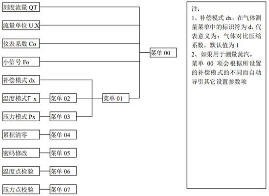 3.1、本儀表表頭采用自導(dǎo)引式和菜單式相結(jié)合的參數(shù)設(shè)置方式,所謂自導(dǎo)引式參數(shù)設(shè)置方式就是用戶在進(jìn)入菜單 00 項(xiàng)后,表頭中的微電腦會(huì)自動(dòng)導(dǎo)引用戶去設(shè)置需要設(shè)置的參數(shù)。另外,用戶也可以通過菜單模式分別對(duì)各組參數(shù)進(jìn)行設(shè)置。蒸汽測(cè)量菜單框圖如下: