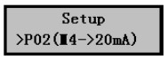 1)在分體式超聲波液位計(jì)正常工作時(shí)按擊Mode鍵進(jìn)入?yún)?shù)設(shè)置菜單后按擊▼鍵選擇P02(4~20mA)設(shè)置菜單,如右圖。