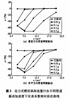 為了對(duì)比不同方向管道振動(dòng)對(duì)渦街流量計(jì)測(cè)量的影響,將管道振動(dòng)改為水平方向重新進(jìn)行試驗(yàn),得到圖3(b)曲線。通過(guò)與圖3(a)比較,發(fā)現(xiàn)兩種情況下流速及振動(dòng)加速度對(duì)儀表系數(shù)相對(duì)誤差的影響趨勢(shì)類似。依據(jù)先前擬定的抗振標(biāo)準(zhǔn),應(yīng)力式模擬